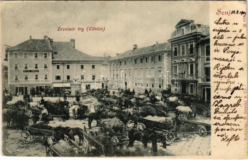 1904 Senj, Zengg; Zvonimir trg (Cilnica) / piac, Hotel Zagreb szálloda... https://www.darabanth.com/de/502-Fernauktion/502.0/Ansichtskarten/Kroatien~3000006/1904-Senj-Zengg-Zvonimir-trg-Cilnica-piac-Hotel-Zagreb-szalloda-market-hotel-gyurodes-~II3412605