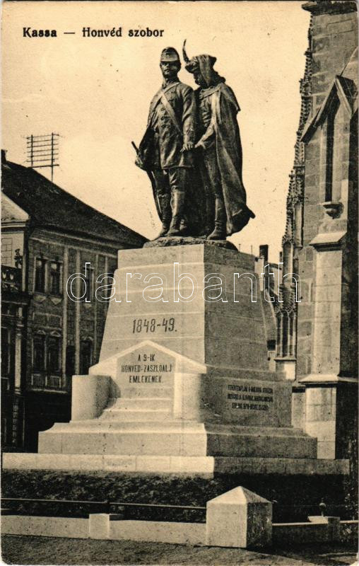 1915 Kassa, Kosice; Honvéd szobor a 9. honvéd zászlóalj emlékének (1848-49). Nyulászi Béla kiadása / Hungarian military monument + "KASSAI NÉPBANK" + "K.U.K. MILITäRZENSUR SITZ DER KOMMISSION KASSA" (EK)