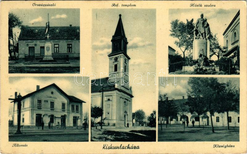 1944 Kiskunlacháza, Országzászló, református templom, Hősök szobra, ál... https://www.darabanth.com/de/502-Fernauktion/502.0/Ansichtskarten/Ungarn~3000001/1944-Kiskunlachaza-Orszagzaszlo-reformatus-templom-Hosok-szobra-allomas-kozseghaza-Ozv-Puhi~II3411793