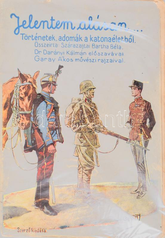 Jelentem alásan... Történetek, adomák a katonaéletből. Összeírta: Szárazajtai Bartha Béla, Dr. Darányi Kálmán előszavával, Garay Ákos művészi rajzaival. Székesfehérvár, 1935, Csitáry G. Jenő Könyvnyomdája. 143p. Kiadói papírkötés, kissé sérült borító. Főhadnagy tulajdonosi bejegyzésével.