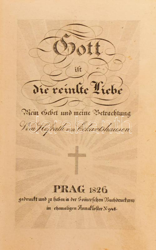 Hofrath von Eckartshausen: Gott ist die reinste Liebe. Mein Gebet und meine Betrachtung. Von dem - -. Prag, 1826, Somerschen Buchdruckerei, 1 (címkép) t+1 (címlap) t. +248+4 p. Német nyelven. Korabeli aranyozott egészbőr-kötés, kopott borítóval, néhány lap szélén szöveget nem érintő kis hiánnyal.