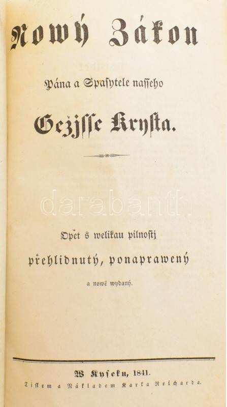 Novy Zákon Pána a Spasytele nasseho Gezjsse Krysta : dpet s welikau pilnosti prehlidnuty, ponapraeny a nowe wydany. Hozzákötve: Cely (?) Zaltar Kra'le a proroka Dawida (...) Kyseku [Kőszeg], 1841, Reichard Károly Nyomda. 275+74 p. Korabeli egészbőr-kötésben, gerincen és borítón kopásnyomokkal, színezett lapélekkel.