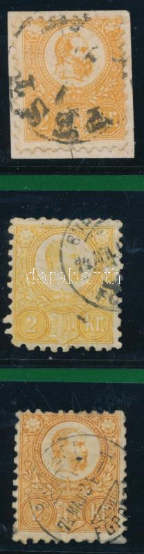 Beschreibung: 1871 1 db Kőnyomat 2kr + 2 db Réznyomat 2kr, az egyik javított