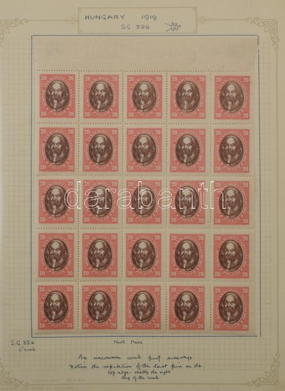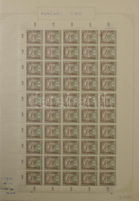 Ívdarabok, nagyobb összefüggések az 1910-40-es évekből (Arató, Árvíz, Hadisegély I., Magyar tanácsköztársasági arcképek 20f + 40f, Széchenyi stb.), köztük sok hármaslyukasztású is, fehér gyűrűs mappában