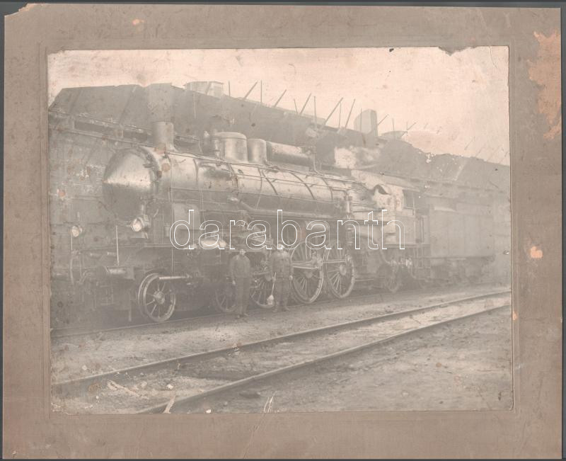 cca 1910 Gőzmozdony egy állomásnál, nagyméretű fotó kartonon, kissé sérült, foltos, 23,5x30 cm, karton: 29,5x36 cm / cca 1910 Locomotive at a station, large-size photo on cardboard, slightly damaged, stained