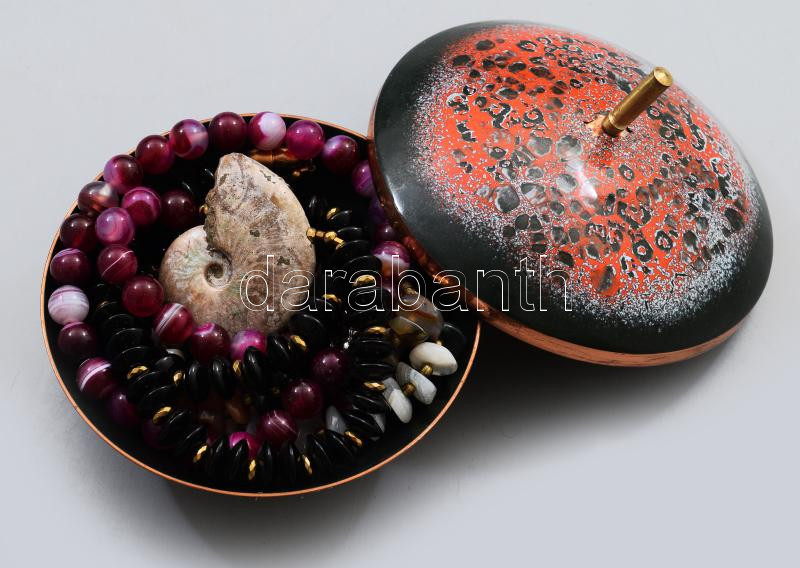 Beschreibung: Iparművész doboz, benne 3 nyaklánccal, egyiken fosszília medál.
