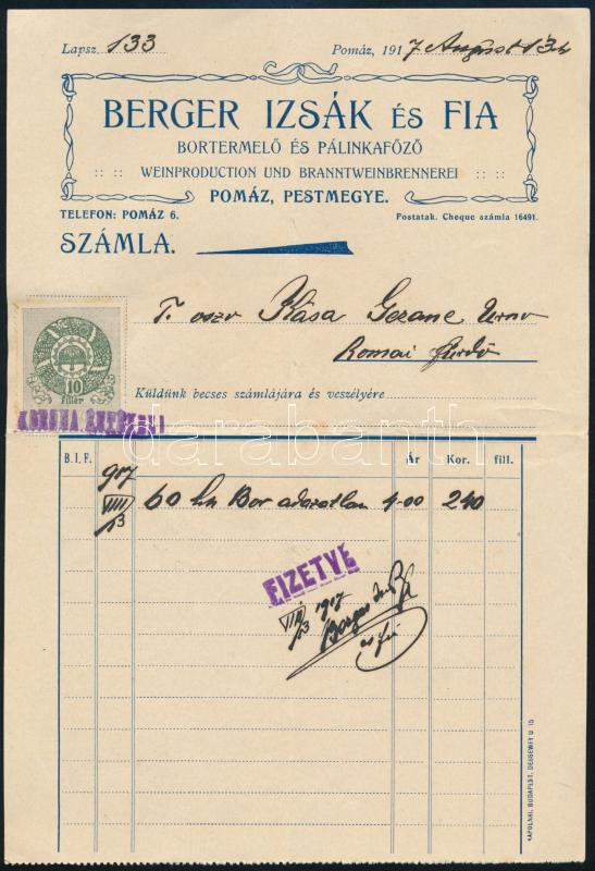 1917 Pomáz, Berger Izsák és Fia Bortermelő és Pálinkafőző cég kitöltött számlája 10 filléres okmánybélyeggel, "korona értékben" felülbélyegzéssel, hajtva