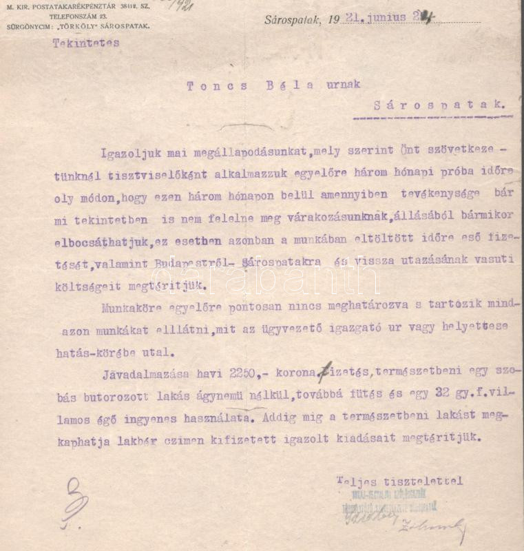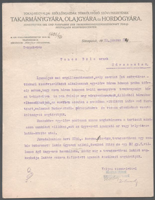 1921 Sárospatak, Tokaj-Hegyaljai Szőllősgazdák Törkölyfőző Szövetkezet... https://www.darabanth.com/de/502-Fernauktion/502.0/Kunst-Dokumente-andere-Sammelgebiete/Dokument~3000101/1921-Sarospatak-Tokaj-Hegyaljai-Szollosgazdak-Torkolyfozo-Szovetkezetenek-Takarmanygyara-~II3415836