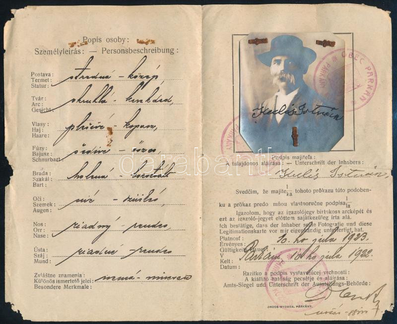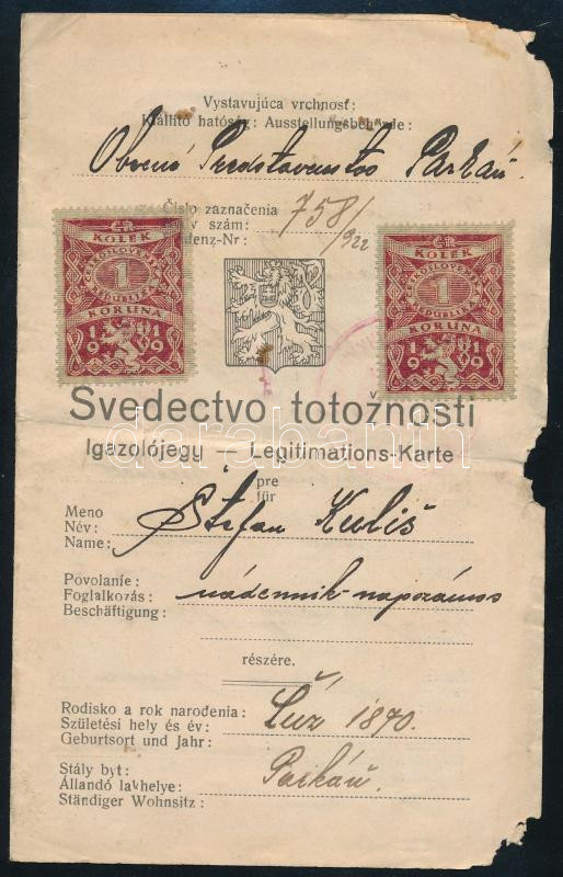 1922 Párkány (Štúrovo), fényképes igazolójegy Kulis István napszámos részére, magyar, cseh és német nyelven, csehszlovák okmánybélyegekkel, kisebb sérülésekkel
