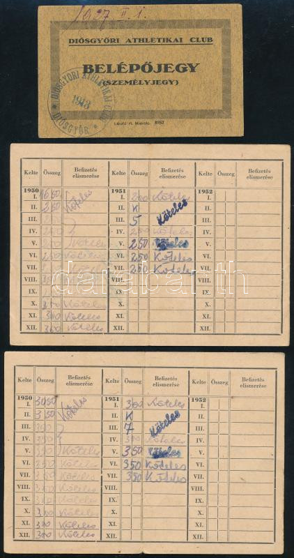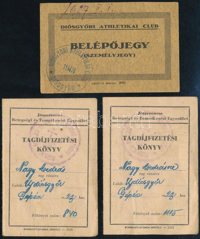 1927 Diósgyőri Athletikai Club belépőjegy (személyjegy), hátoldalán feljegyzésekkel + cca 1950 Újdiósgyőr, Jószerencse Betegségi és Temetkezési Egyesület tagdíjfizetési könyv, 2 db