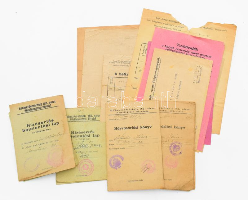 cca 1929-1945 Hódmezővásárhely, állattartással, gazdálkodással kapcsolatos iratok: hízósertés bejelentési lap, húsvásárlási könyv, ebigazolvány, stb., összesen kb. 18-20 db, vegyes állapotban