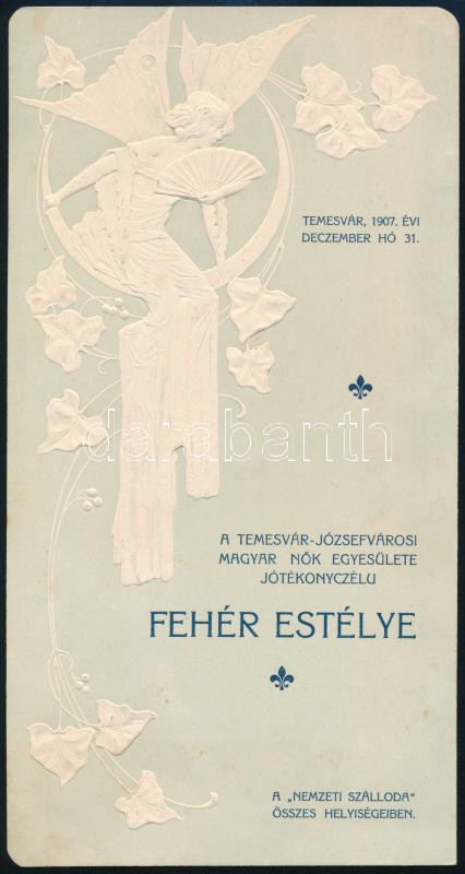 1907 A Temesvár-Józsefvárosi (Erdély) Magyar Nők Egyesülete jótékony célú Fehér Estélye a Nemzeti Szállodában, dombornyomott, szecessziós karton, szép állapotban