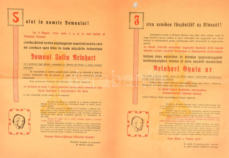 1936 Arad, Reinhart Gyula kézműiparos céh díszmesterré választásról sz... https://www.darabanth.com/de/502-Fernauktion/502.0/Kunst-Dokumente-andere-Sammelgebiete/Drucksachen~3000109/1936-Arad-Reinhart-Gyula-kezmuiparos-ceh-diszmesterre-valasztasrol-szolo-diszes-ketnyelvu~II3418857