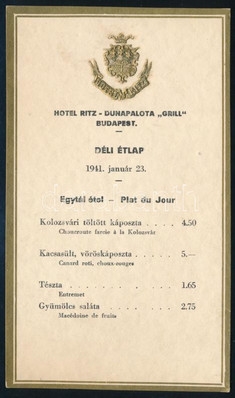 1941 A budapesti Hotel Ritz - Dunapalota "Grill" éttermének déli étlap... https://www.darabanth.com/de/502-Fernauktion/502.0/Kunst-Dokumente-andere-Sammelgebiete/Drucksachen~3000109/1941-A-budapesti-Hotel-Ritz-Dunapalota-Grill-ettermenek-deli-etlapja-arany-dombornyomott~II3417276