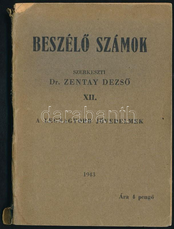1943 Beszélő számok. Szerk.: Zentay Dezső. XII. A legnagyobb jövedelmek. (A legnagyobb jövedelemmel rendelkező magyar személyek listája). Bp., Globus-ny., 128 p. Kiadói papírkötés, kissé sérült borítóval és gerinccel.