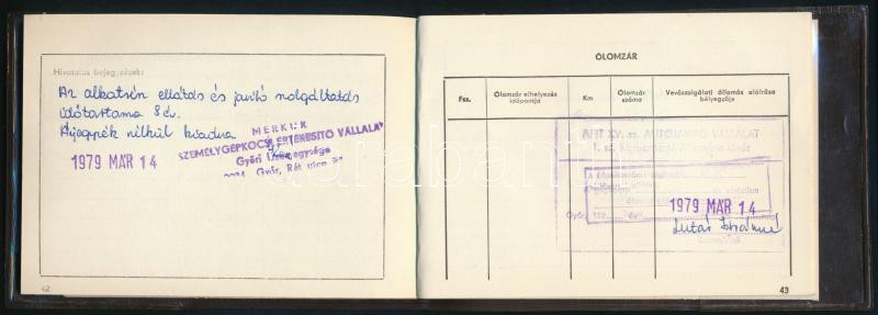 Beschreibung: 1979 Skoda-típusú személygépkocsi jótállási jegye, benne Merkúr befizetési csekkek