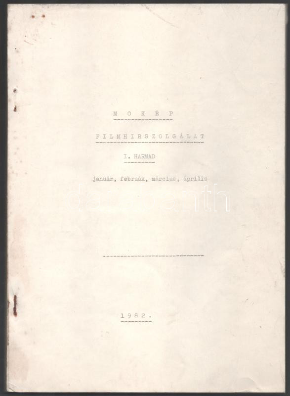 1982 MOKÉP filmhírszolgálat, I. harmad (január, február, március, április). Bp., MAFILM sokszorosító üzem-ny., 153 p. Tűzve, helyenként kissé foltos, néhány a tűzéstől részben elváló lappal. Készült 300 példányban.