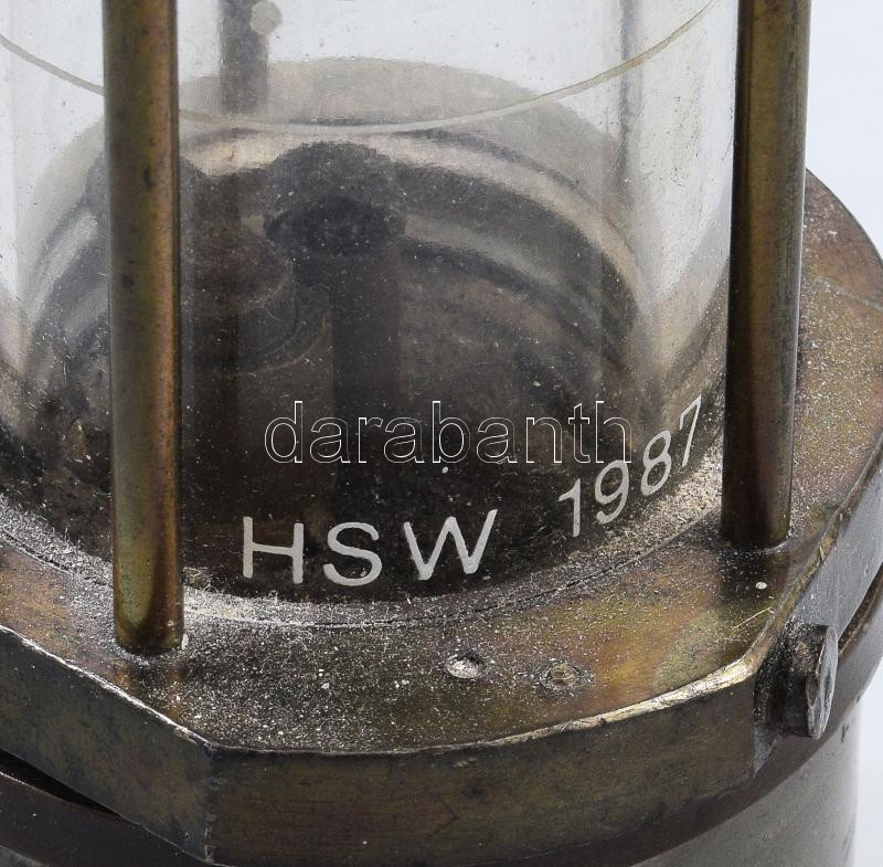 Beschreibung: Nagyobb méretű bányászlámpa, réz, fém, üveg, jelzett, m: 28 cm