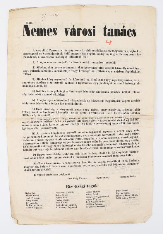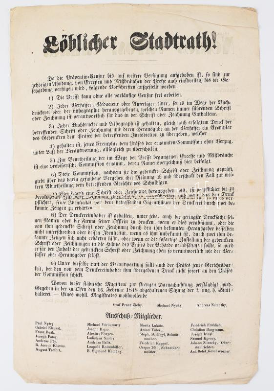 1848 Nemes városi tanács... kezdetű körlevél a helyhatóságokhoz, melyben a cenzúra eltörlése után a helyi kiadványokra vonatkozó szabályozást tartalmazza, miszerint a kinyomtatott példányt kell elküldeni a bizottságnak aki vizsgálja a sajtó útján elkövetett visszaéléseket. a bizottság tagjainak névsorával Deák, Vörömarty, Bajza, Eütvös, Klauzál, stb. Két nyelven. Ritka! 27x42 cm