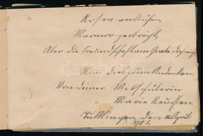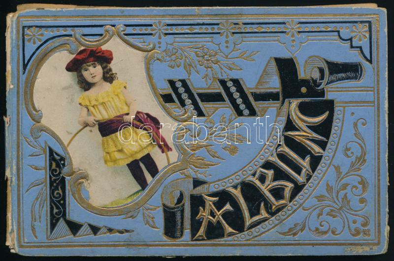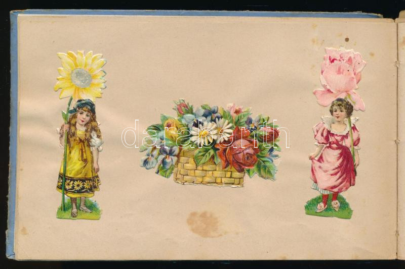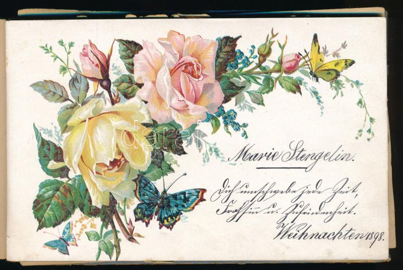 1898-1901 Régi emlékkönyv, német nyelvű bejegyzésekkel, beragasztott különféle litó képekkel (virágokkal, figurális képekkel...stb.), korabeli illusztrált kartonált papírkötésben, kopott borítóval, sérült gerinccel, laza fűzéssel.