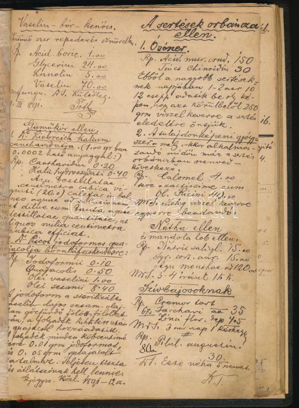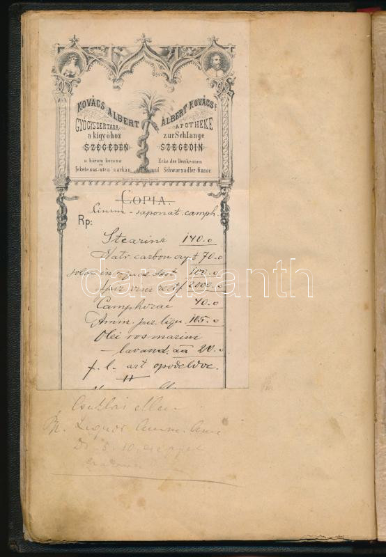 cca 1880-1900 Orvosi, gyógyszerészeti témájú jegyzetek, kb. 50-60 kézzel beírt oldal + néhány gyógyszerrecepteket tartalmazó nyomtatott lap; az egyik oldalon beragasztva Kovács Albert szegedi Kígyó gyógyszertárának receptje. Átkötött egészvászon-kötésben, részben sérült, foltos lapokkal.