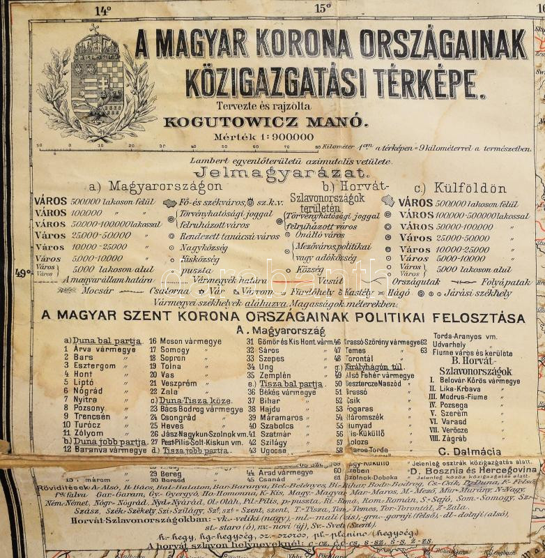 1890 Kogutowicz Manó, A Magyar Korona Országainak közigazgatási térkép... https://www.darabanth.com/de/502-Fernauktion/502.0/Kunst-Dokumente-andere-Sammelgebiete/Landkarten~3000110/1890-Kogutowicz-Mano-A-Magyar-Korona-Orszagainak-kozigazgatasi-terkepe-Bp-Magyar-Foldrajzi~II3415453