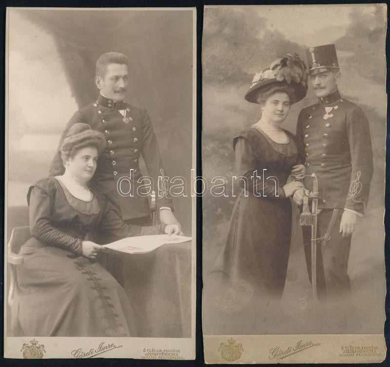1909 Kiskunfélegyháza, kitüntetett katonatiszt és felesége, 2 db kabinetfotó Gárdi Imre fényképész műterméből, az egyik hátoldalán autográf sorokkal, vágott/sérült karton, 20x11 cm körül