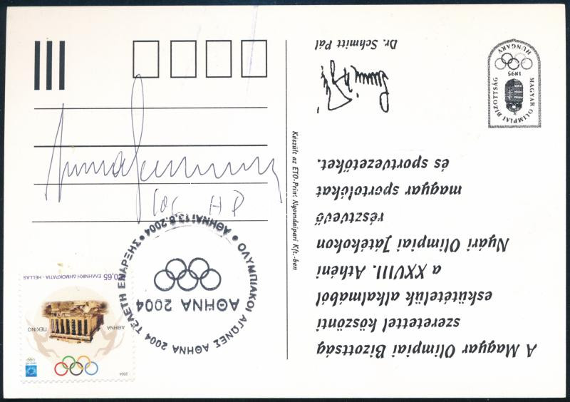 Beschreibung: 1994 Juan Antonio Samaranch (1920-2010) NOB elnök aláírása 2004 Athén olimpia bélyegzésű lapon