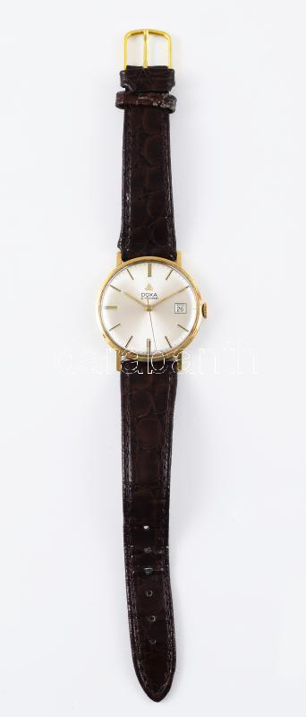 Beschreibung: Doxa arany (Au) karóra, napkijelzéssel, 14k, jelzett, bőr szíjjal, hátoldalán MNK BM ajándékozási vésettel, működik, cserélt koronával, d: 33 mm