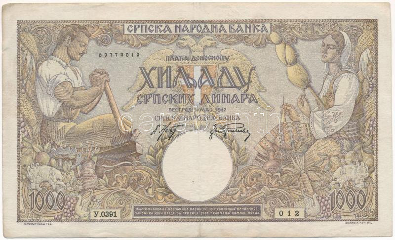 Serbia / German occupation 1942. 1000 Dinara with women head watermark "Y.0391 012" C:XF,VF