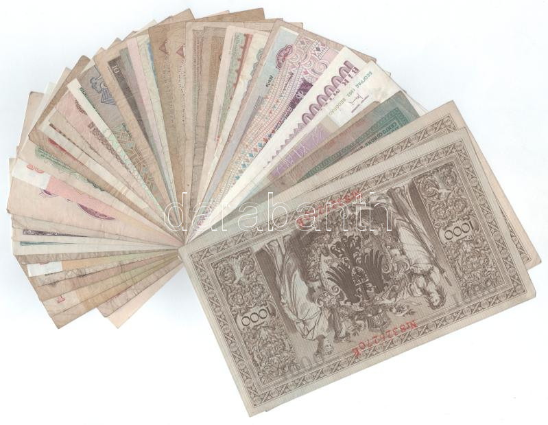 Beschreibung: Vegyes, 46db-os külföldi bankjegytétel, közte Ausztria / Szövetséges megszállás 1944. 1Sch + 2Sch + 5Sch + Német Harmadik Birodalom 1942. 5M (2x) + Szövetséges megszállás 1944. 1M + Csehszlovákia 1987. 50K + 1988. 20K T:vegyes