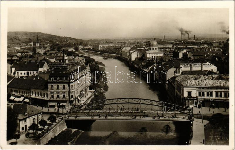 Nagyvárad, Oradea; látkép a Körössel, híd, zsinagóga, Iván vendéglő, étterem, Deutsch, Friedmann Dezső üzlete / Cris riverside, bridge, synagogue, shops, restaurant (fl)