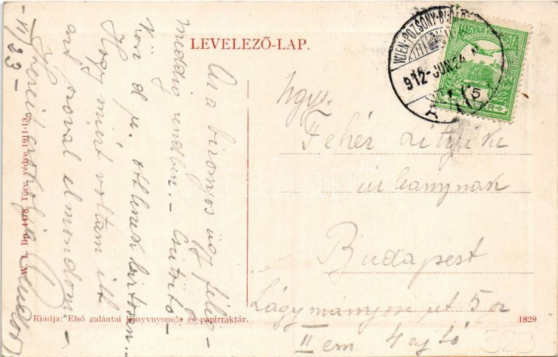 1912 Galánta, Fő utca, templom, Takarékpénztár, Ottinger Károly üzlete. Első galántai könyvnyomda és papírraktár kiadása W.L. Bp. 4478. / main street, church, savings bank, shops (EK)