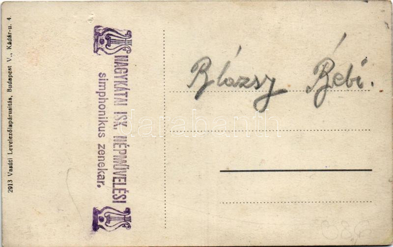 Beschreibung: Homonna, Humenné; Szirtalja, nyaraló. Vasúti levelezőlapárusítás 2913. / Podskalka, villa + "Nagykátai Isk. Népművelési simphonikus zenekar" (Rb)