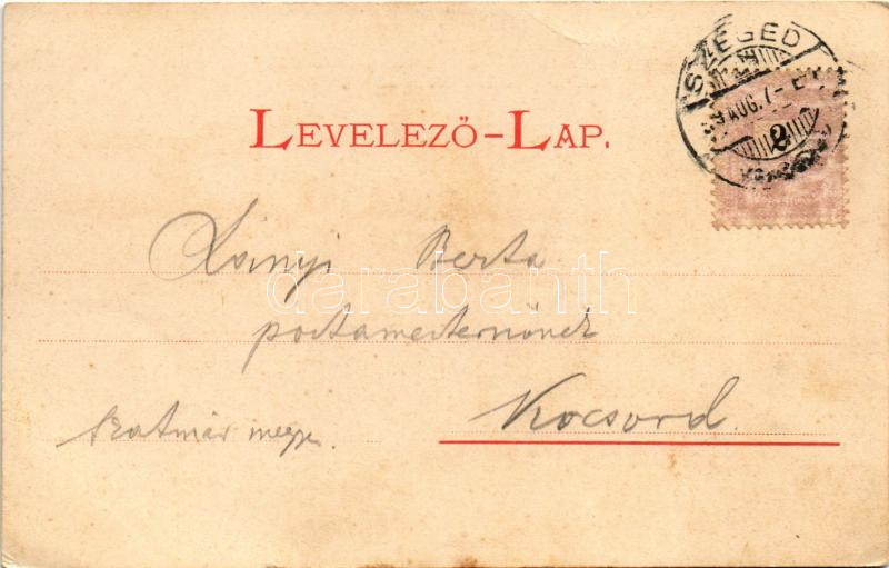 1899 (Vorläufer) Szeged, Dugonics tér a Kir. ítélő táblával, színház, Széchenyi tér a Városházával. Endrényi Imre Nr. 1050. Art Nouveau, floral, litho (felületi sérülés / surface damage)
