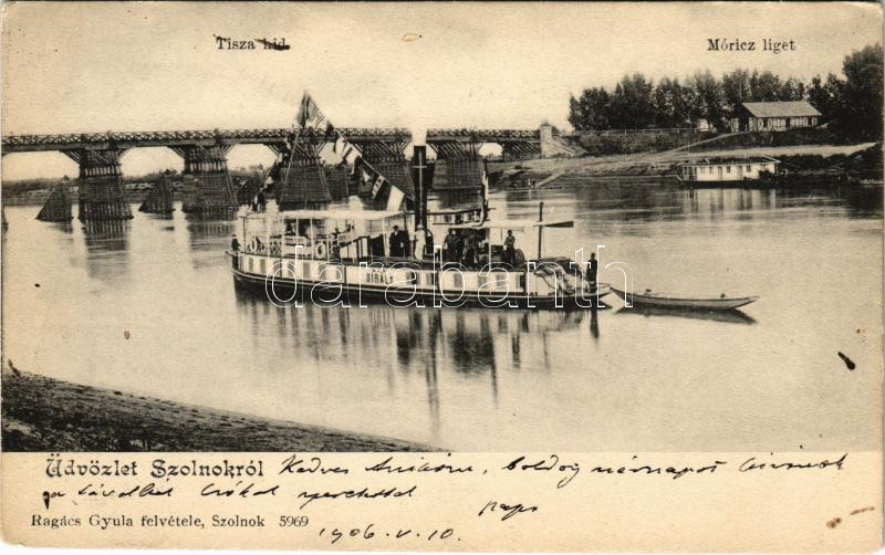 1906 Szolnok, Tisza híd, Móricz liget, "Sirály" csavaros vontató gőzhajó (a hajónév felett a "MÁK" vagyis Magyar Állami Kotrások felirat). Ragács Gyula felvétele (EK)