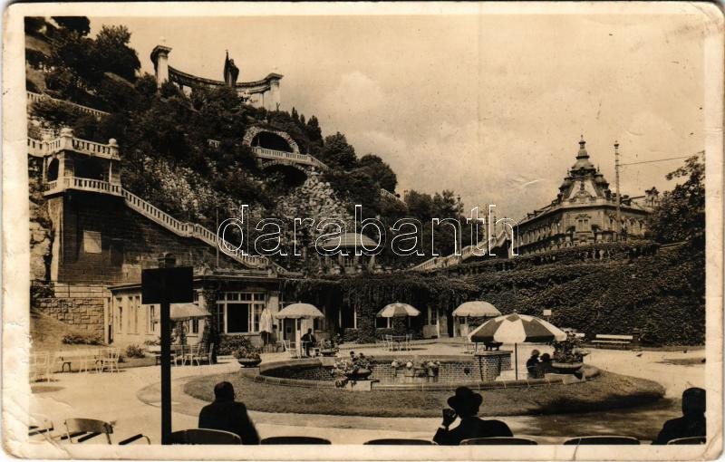 Beschreibung: Budapest I. Szent Gellért szobor, Hungária és Attila gyógyforrások, Rudas Ivócsarnok, az Erzsébet híd budai hídfőjénél (gyűrődések / creases)