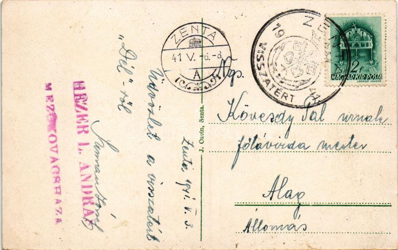 Beschreibung: 1941 Zenta, Senta; Állami gimnázium. J. Cucin kiadása / grammar school + "1941 ZENTA VISSZATÉRT" So. Stpl