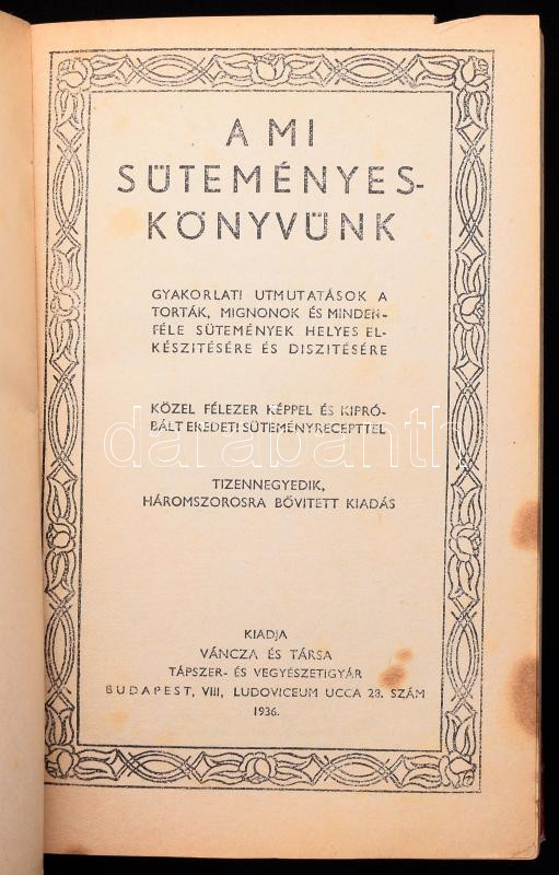 A mi süteményes könyvünk. Váncza könyv. Bp.,1936, Váncza és Társa. Tiz... https://www.darabanth.com/de/504-Fernauktion/504.0/Bucher/Bucher-Gastronomie-und-Gartnerei~2500027/A-mi-sutemenyes-konyvunk-Vancza-konyv-Bp-1936-Vancza-es-Tarsa-Tizennegyedik-haromszo~II3422885
