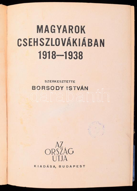 Borsody István (szerk.): Magyarok Csehszlovákiában 1918-1938. Bp., [1938], Az Ország Útja, 223 p. Első kiadás. Átkötött félvászon-kötésben, kissé viseltes borítóval és gerinccel, kissé sérült címlappal, intézményi bélyegzőkkel.