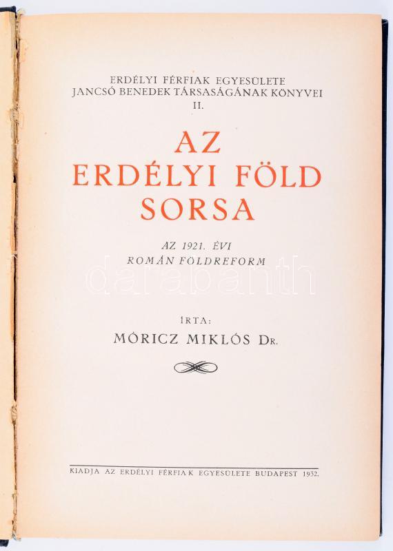Móricz Miklós: Az erdélyi föld sorsa. Az 1921. évi román földreform. Bp., 1932, Erdélyi Férfiak Egyesülete. Kiadói egészvászon kötés, kopottas borítóval, kissé sérült gerinc.