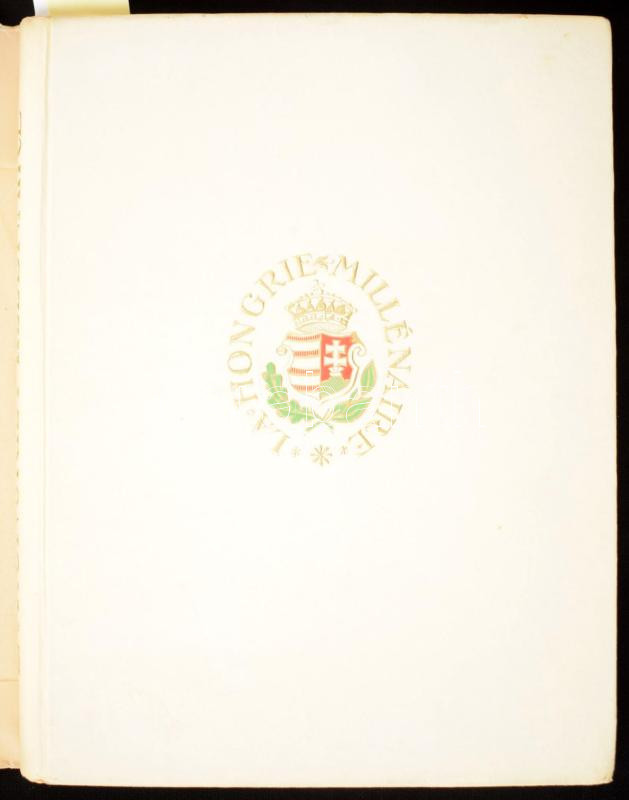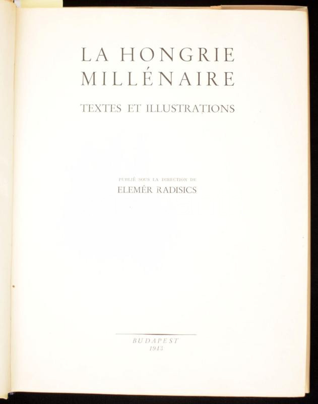 Radisics Elemér: La Hongrie millénaire. Textes et illustrations. Bp., 1943, (Athenaeum-ny.), X+(2)+194+(2) p. + 24 (színes, közte egy kihajtható) t. Francia nyelven. [Magyarország történetét, művészetét, kultúráját bemutató, gazdag képanyaggal illusztrált propaganda kiadvány]. Kiadói díszes, aranyozott, dombornyomott kartonált papírkötés, javított kiadói illusztrált papír védőborítóban, átlátszó papír védőborítóban.