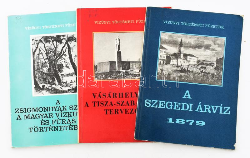 Vízügyi Történeti Füzetek 3 db száma: A szegedi árvíz 1879. (Adalékok a Tisza-szabályozás történetéhez).; Botár Imre - Károlyi Zsigmond: Vásárhelyi Pál, a Tisza-szabályozás tervezője.; Csath Béla: A Zsigmondyak szerepe a magyar vízkutatás és fúrás történetében. Bp., 1969-1983, Vízdok, 80 p.; 76 p.+ 1 (kihajtható térkép) t.; 100 p. Kiadói papírkötés, változó állapotban.