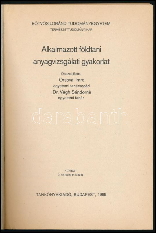 Alkalmazott földtani anyagvizsgálati gyakorlat. Összeáll.: Orsovai Imre, Végh Sándorné. Eötvös Loránd Tudományegyetem Természettudományi Kar. (Kézirat). Bp., 1989, Tankönyvkiadó, 189+(1) p. Kiadói papírkötés.