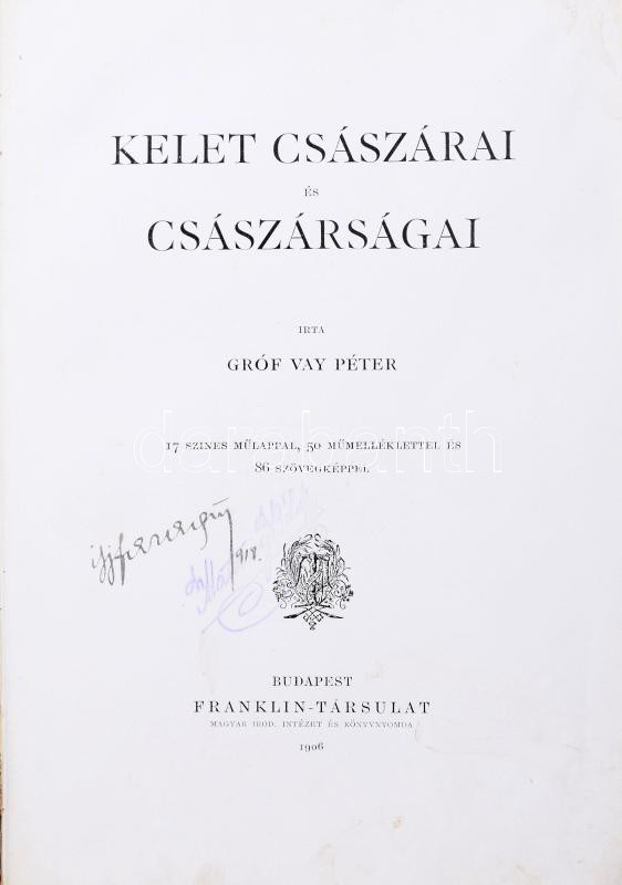 Vay Péter: Kelet császárai és császárságai. 17 színes műlappal, 50 műmelléklettel és 86 szövegképpel. Bp., 1906, Franklin-Társulat, 465+(1) p.+ 67 t. Egyetlen kiadás. Szövegközti és egészoldalas, fekete-fehér és színes illusztrációkkal. Kiadói egészvászon-kötés, kissé viseltes állapotban, foltos borítóval, helyenként kissé sérült, foltos lapokkal, tulajdonosi névbejegyzéssel és bélyegzőkkel.