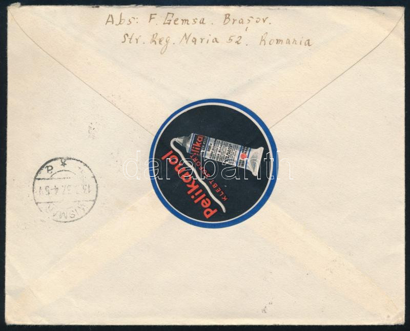 Románia 1932 Ajánlott levél légiposta bélyeggel, a hátoldalon reklám l... https://www.darabanth.com/de/504-Fernauktion/504.0/Erlesene-Lose-und-Sammlungen-Ausland/Einzelne-Gebotslose-Weltweit~500008/Romania-1932-Ajanlott-level-legiposta-belyeggel-a-hatoldalon-reklam-levelzaroval-BRASOV~II3422178