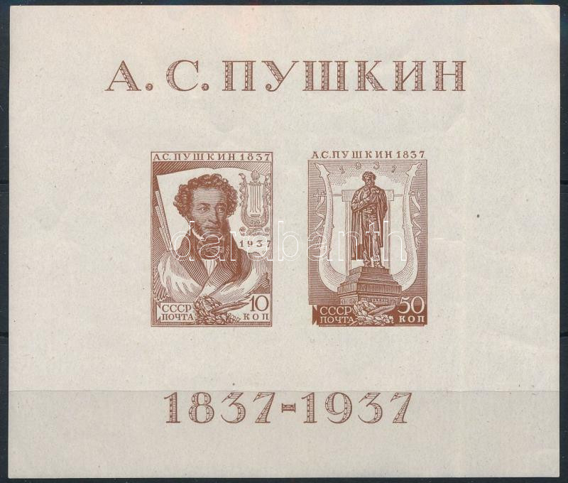 Szovjetunió 1937 Puskin blokk (törés / folded) https://www.darabanth.com/de/504-Fernauktion/504.0/Erlesene-Lose-und-Sammlungen-Ausland/Sammlungen-und-Lose-Welt~500011/Szovjetunio-1937-Puskin-blokk-tores-folded~II3424799