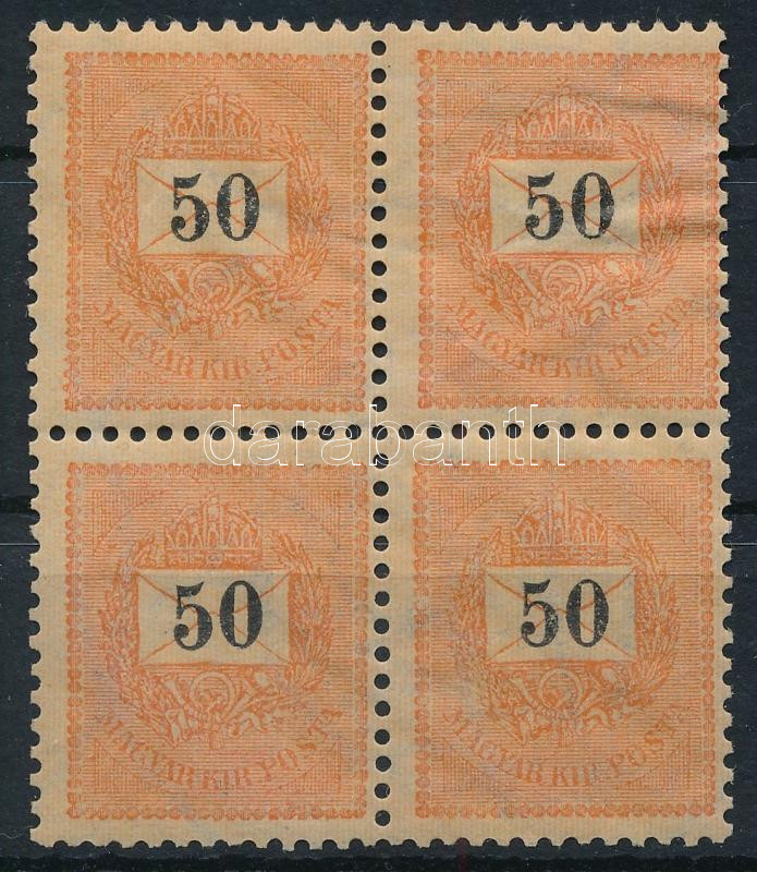 Beschreibung: 1889 Feketeszámú 50kr 4-es tömbben (36.000) (gumihiba a jobb felső bélyegen / gum disturbance)