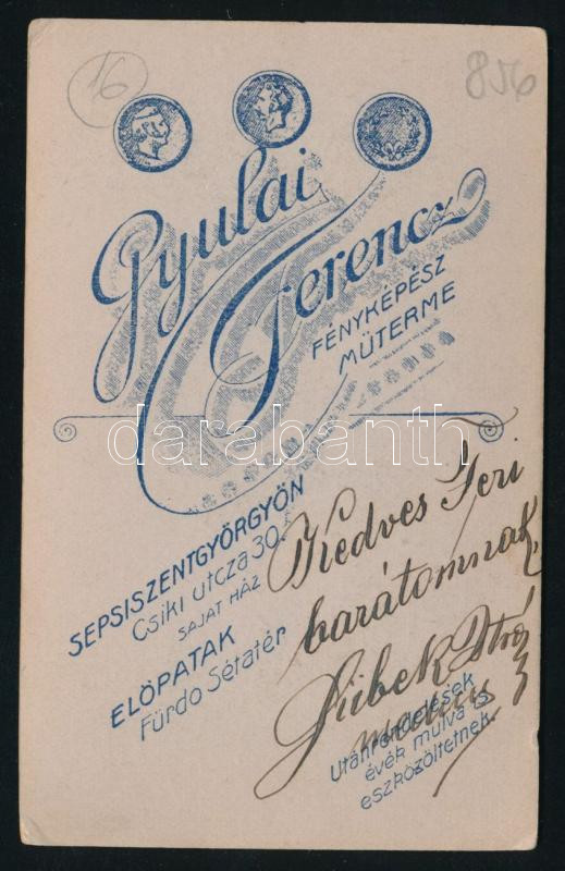 cca 1910 Fiatal férfi portréja (Sübek? István medikus), vizitkártya Gyulai Ferenc erdélyi fényképész (Sepsiszentgyörgy, Előpatak) műterméből, a hátoldalon dedikációval, 10,5x6,5 cm