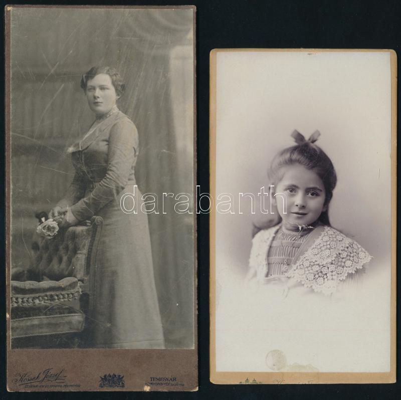 Beschreibung: cca 1910 Kislány és hölgyportré, 2 db keményhátú fotó Kossak (Arad, Temesvár) műterméből, vágott karton, kopásnyomok, 14×8 cm